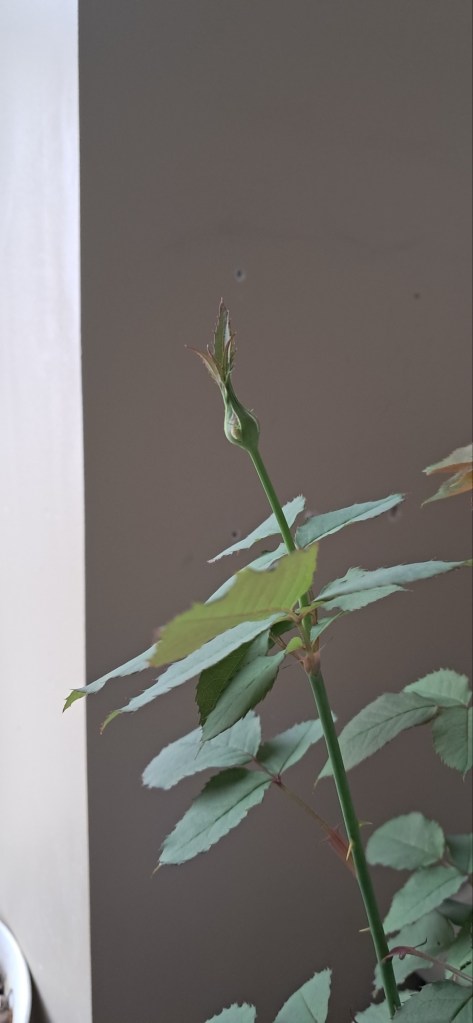 Estelle was screaming “NOT DEAD!” as elegantly as she could with that little pink stem. Once she found her footing, Estelle knew no limits. I think I finally understood what my mom felt like when I graduated when I saw her first leaves. I was prepared to wait a year to get my first bloom, but Estelle couldn’t wait to show me what she’s capable of. I was getting ready to leave for Branson and she looked like this: (I found the rose in the white bucket in a brush pile, it might not make it, pretend you don’t see it 😉