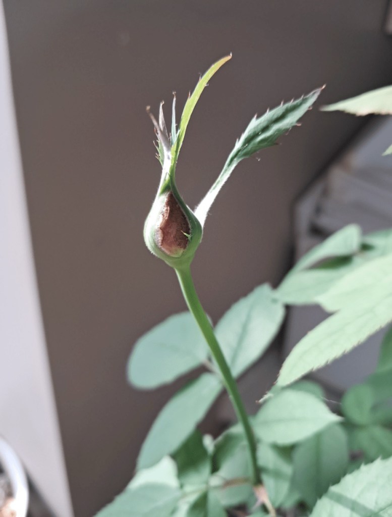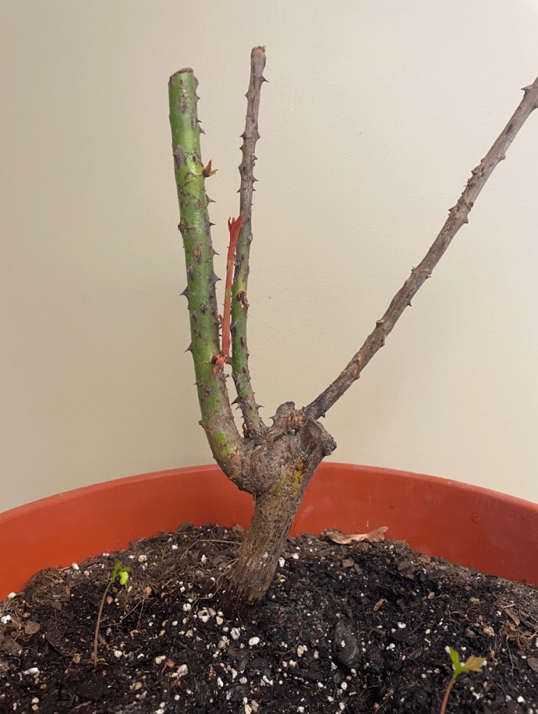 After a bit more reading up on the history of roses and rereading ‘The Possibility of Evil’ eighteen times, I decided I wanted to start a small, curated greenhouse in my apartment starting with a prized centerpiece: a Mr. Lincoln hybrid tea cup rose bush perfuming the air. One day, David Austin tea cup roses will be back in stock and I will get one. But in the, meantime, I purchased my first rose bush from a different online nursery. I placed my order in late April. When I opened the box, there was a large crown with nine inch roots, three bright green stalks, and a handful of bright red, healthy nodes poking off the stems. However, after planting, the plant suffered from transplant shock for the first three weeks. The nodes dried up and one of the stalks turned dark.